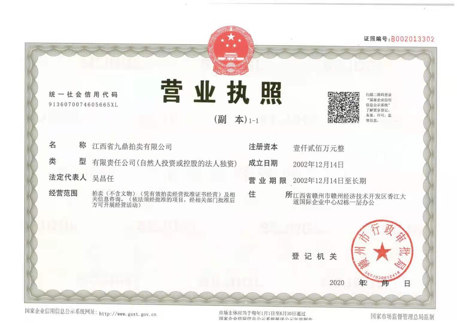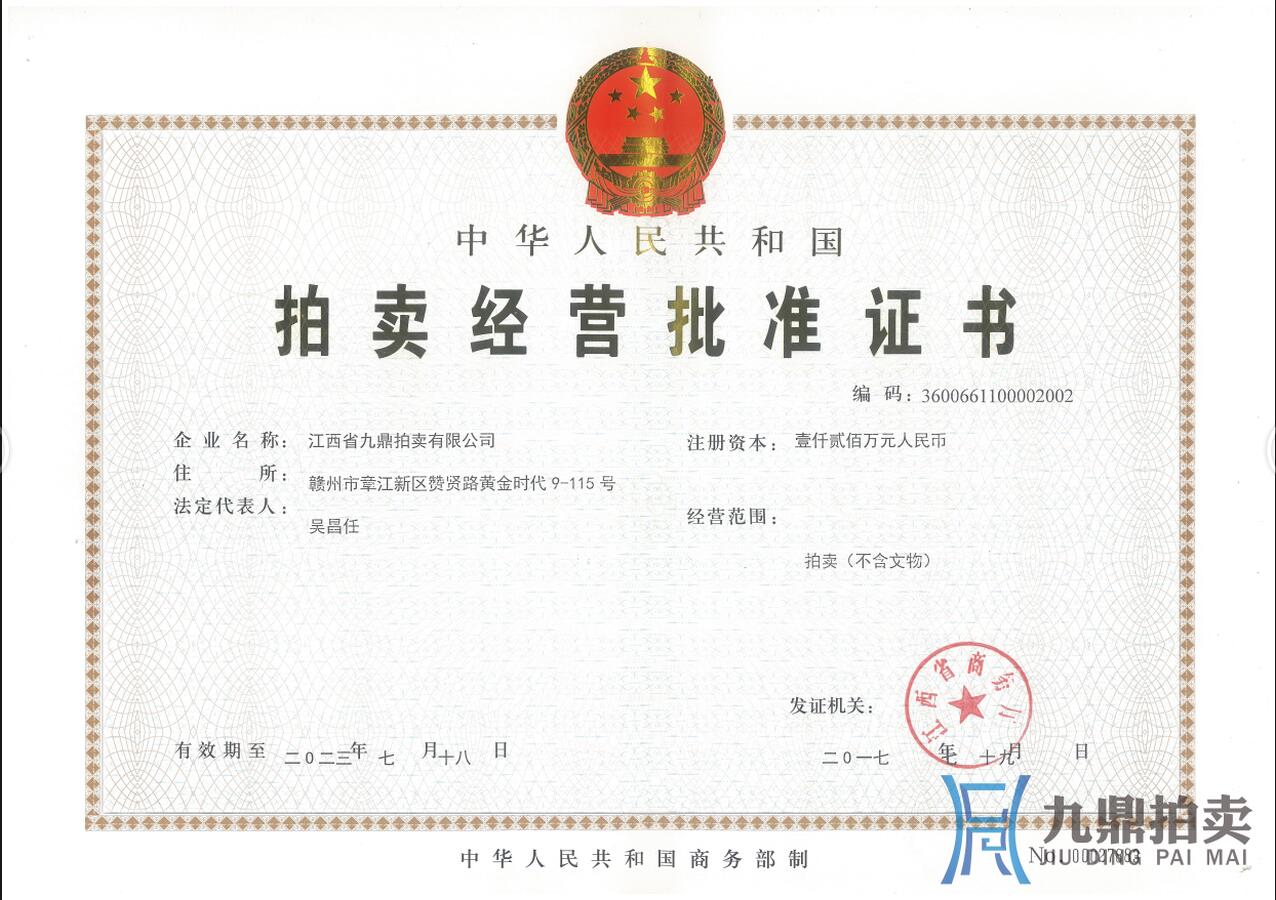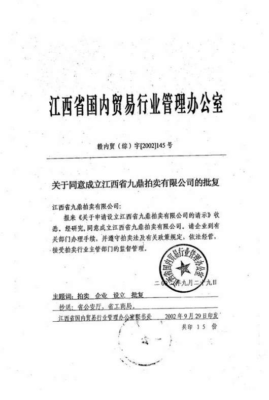 關(guān)于同意成立江西省九鼎拍賣有限公司的批復(fù)